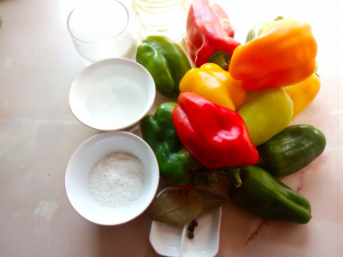Как сделать маринованный болгарский перец на зиму? Подготовьте указанные продукты. Для закуски выберите целый болгарский перец без повреждений. Желательно брать его разного цвета, чтобы заготовка выглядела интересней. Стеклянные банки помойте с содой, поставьте еще влажные в холодную духовку вверх дном. Разогрейте печь до 150°С и стерилизуйте после достижения температуры банки объёмом 0,5 л - 5 мин, 1 л - 10 мин. Крышки вымойте и прокипятите.