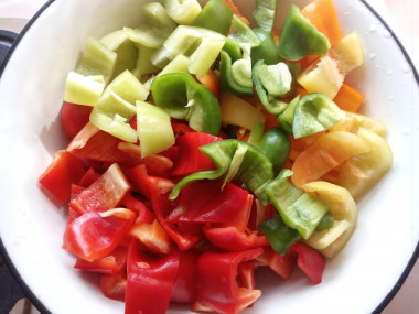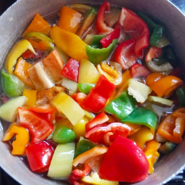 В кипящий маринад выложите нарезанный болгарский перец. Весь перец сразу может не поместиться, процедуру можно делать в два приёма.