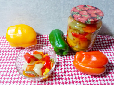 Икала как бы разнообразить закуски из болгарского перца и нашла вот этот замечательный рецепт. Правда внешне у меня получился немного другой результат. Я брала только зеленые перцы, просто у меня их было очень много. Нарезала крупными полосками вдоль. Маринад сварила точно по рецепту. Добавила сушеный укроп для аромата. Правда по привычке добавила несколько зубков чеснока, я его везде кладу. Но чеснок я пропустила через пресс, это было ошибкой, он этого рассол помутнел. На вкусе это не отразилось) Просто теперь буду знать, что если в заготовки добавлять чеснок, то только целиком. Тем не менее, хоть рассол и не прозрачный как слеза младенца, но вкус великолепный. Перец у меня не очень сладкий, поэтому сахара в самый раз, я вообще люблю сладковатые заготовки. Дети у нас такие закуски не едят, а вот мы с мужем баночку распаковали на ужин, очень вкусно. Перец не разварился, сладко-кислый на вкус. С жареной картошкой было очень вкусно. Спасибо за рецепт. В следующий раз сделаю без чеснока.