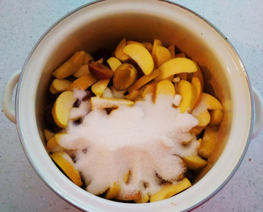 Засыпьте фрукты сахаром и оставьте настояться на время от 2 до 12 часов. Воду добавлять не нужно, сока и так будет достаточно.