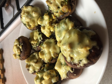 Шампиньоны получились очень вкусными! Я брала крупные грибы, их было удобно начинять. Но половина начинки осталась. Из нее я сделала соус к макаронам.