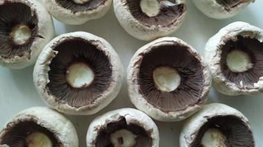 Покупайте свежие шампиньоны среднего размера, снежно-белого цвета без пятен, повреждений, запаха гнили. На ощупь они не должны быть скользкими. Тщательно промойте грибы от грунта под струей теплой или холодной воды. Вырежьте подпорченные места, если они есть. Миниатюрные грибочки размером до 2 см чистить совершенно не обязательно, достаточно их хорошо промыть. Более крупные шампиньоны рекомендуется чистить от пленочек.