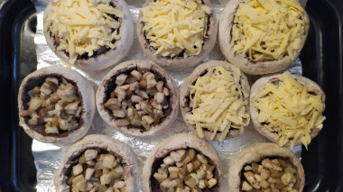 Огнеупорную форму для запекания смажьте ее растительным маслом и выложите в неё шляпки шампиньонов. Разложите начинку с помощью двух чайных ложек.