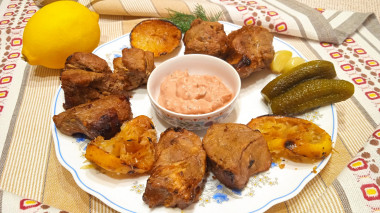 Отличный шашлык получился пот этому рецепту. Хоть и нет характерного для шашлыка запаха дыма, кусочки мяса, запеченные на подушке из промаринованного лука, приобрели шашлычный вкус. Мы брали свиную шею, Мясо получилось такое нежное, что можно есть губами. За 20 минут до окончания готовки я разрезала пакет и поставила противень под верхний гриль. Получилась зажаренная корочка, а мой муж особенно оценил пропитанные мясными соками поджаренные лимоны.