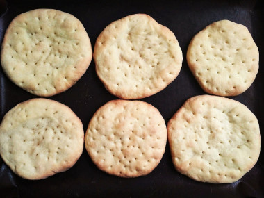 Переложите лепешки на застеленный пергаментом противень. Наколите лепешки вилкой, деревянной шпажкой или зубочисткой.