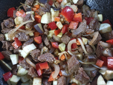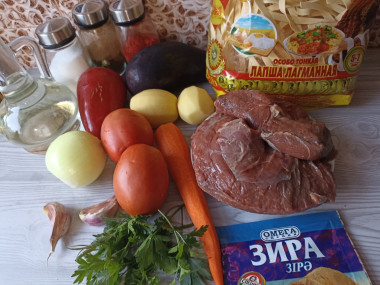 Как сделать жареный лагман по узбекски? Подготовьте продукты. Говядину можно заменить телятиной или бараниной. Чем более мраморное мясо вы берете, тем сочнее и мягче оно получится. Овощи и мясо вымойте под проточной водой. Я буду использовать половину баклажана на свой вкус. Мы будем снимать с помидоров кожицу. Поэтому стоит заранее оценить, снимется ли она легко или нужно будет обдавать помидоры кипятком. Это лучше будет сделать заранее.