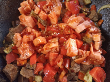 Помидоры порежьте мелким кубиком и добавьте в сковороду.