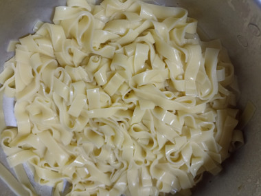 Вскипятите литр воды для лагмана. Добавьте в воду лагман и варите его на одну минуту меньше, чем указано на упаковке. Лапшу лучше варить не всю сразу, а порционно для каждого приема пищи. Ведь свежее вегда вкуснее.