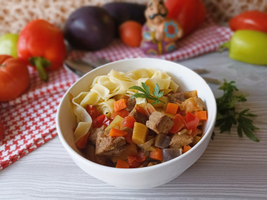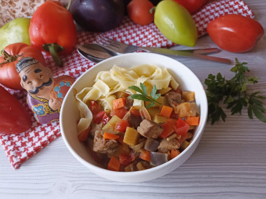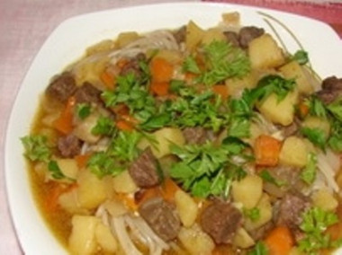 Удивительно, но сочетание в одном блюде и мяса, и картошки, и лапши совершенно не излишнее. За длительное время тушения все эти ингредиенты вместе со специями успевают соединиться в единую гармоничную историю.