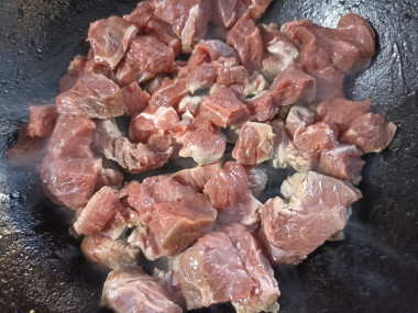 Говядину порежьте на небольшие порционные кусочки. В глубокой сковороде с антипригарным покрытием (или в казане) разогрейте масло и обжарьте говядину до золотистой корочки на сильном огне.