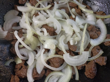 Огонь уменьшите до среднего и добавьте нарезанный тонкими полукольцами лук. Подойдет как белый, так и желтый репчатый лук. Обжаривайте, пока лук не станет полу-прозрачным.