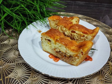 С таким пирогом справится и новичок. Начинку можно взять любую, из картошки, грибов, обжаренного фарша и даже ягод или яблок. Можно делать с рыбными консервами или отварной рыбой с добавлением обжаренного лука или мясную из отварной курицы. Вместо разрыхлителя можно взять простую пищевую соду, но меньше в 2 раза и нужно погасить ее лимонным соком или уксусом. Муку так же можно использовать не только обычную, для не сладких пирогов замените часть на цельнозерновую. Тогда пирог получится более полезный, правда менее нежным и воздушным.