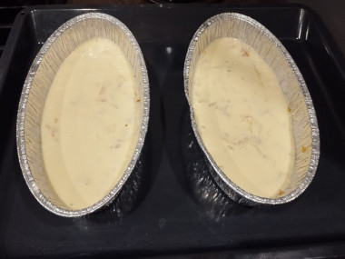 Тесто и начинку я разделила на две формы. На дно форм вылила тесто,затем начинку и опять тесто. Выпекала в духовом шкафу при 180° 40 минут.