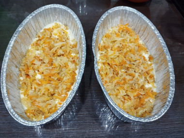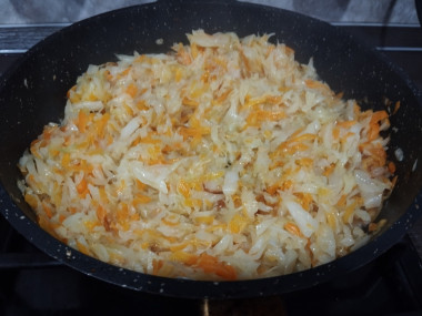 Люблю заливные пироги и на этот раз воспользовалась рецептом: заливной пирог на кефире и майонезе. Для начинки я использовала капусту с морковью. Капусту нашинковала, морковь натерла на крупной тёрке. Выложила капусту с морковью в сковороду,посолила, поперчила и обжарила овощи до готовности.