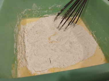 Муку смешайте с разрыхлителем и просейте ее, через сито или используя специальную кружку, в миску со смесью. Замесите тесто. Оно получится воздушное, жидкое. Будьте готовы к тому, что муки может понадобиться меньше или больше.