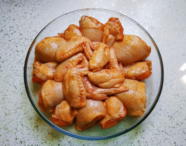 Подготовьте указанные в рецептуре продукты. Как правильно выбрать куриные крылья? Лучше покупать крылышки в охлажденном виде, так как замороженный продукт теряет свои полезные свойства. На поверхности не должной быть кровоподтеков и повреждений. Цвет светло-розовый. Надавите пальцем на мякоть, если вмятина быстро не выпрямится, значит продукт несвежий. Липкая и скользкая поверхность, а также неприятный, кислый запах - также признак испорченности.