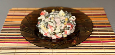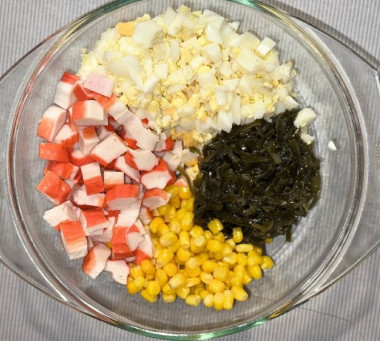 Очень вкусный и легкий в приготовлении салат на каждый день. И хороший вариант для первых кулинарных опытов с ребенком, делали с внучкой.- яйца она измельчила с помощью сеточки, крабовые палочки легко нарезала на кубики обычным столовым ножом. Потом добавили морскую капусту и зерна сладкой кукурузы, а затем сделали каждому яркие тортики в помощью маленького (порционного) кольца. Всем домашним такой "морской" салат очень понравился, обязательно приготовим еще не раз. Спасибо большое за простой и интересный рецепт.