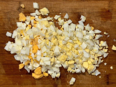 Яйца, предварительно отваренные, охлажденные и очищенные, также нарежьте кубиком. Размер сделайте такой же, как и у палочек — салат будет смотреться красивее и аккуратнее.Шаг 5: