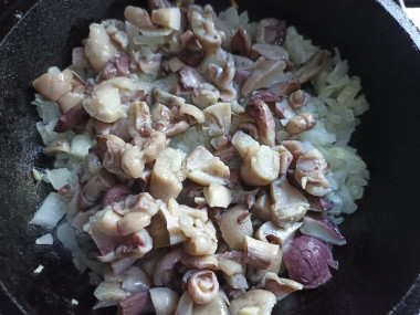 Лук очистите от шелухи и ополосните в холодной воде. Грибы и лук мелко нарежьте. На горячую сковороду налейте немного растительного масла и обжарьте грибы с луком 5-7 минут. Немого подсолите. Готовую грибную начинку остудите.