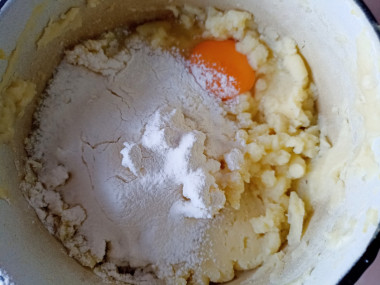 В остывший картофель добавьте яйцо и муку. Перемешайте.
