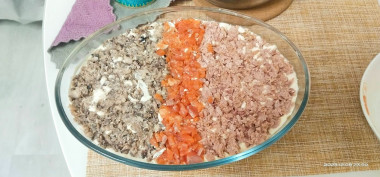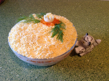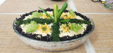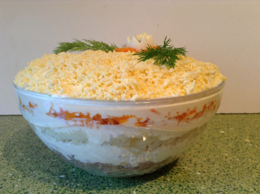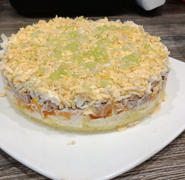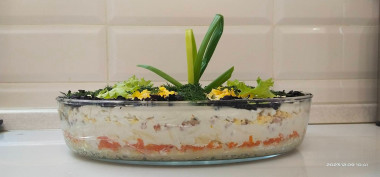 Очень вкусный салат. Быстрый в приготовлении и простой. Но на вкус это не влияет. Я ещё добавила в него немного лук порей в слой ,где рыба. Спасибо за рецепт.