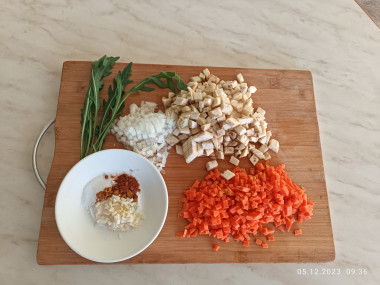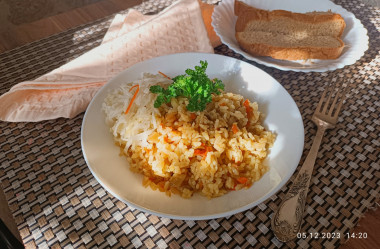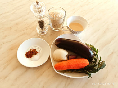 Баклажаны очищенные от кожицы, порезала мелкими кубиками и посолила, чтобы избавиться от специфической горечи. Тем временем пассеровала до прозрачности мелко нарезанные лук с чесноком, добавив куркуму и паприку. Следом обжарила морковь, а также промытые и отжатые баклажаны. Всыпала рис. Его слегка помешивая обжаривала в течении нескольких минут, затем залила 1,5 стакана кипятка. (Всё-таки количество воды зависит от сорта риса).