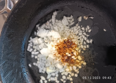 Лук и чеснок очистите от шелухи и мелко порежьте. Сковороду поставьте на огонь, разогрейте её и налейте часть растительного масла. О том, как подобрать идеальную сковороду, а также как правильно выбрать растительное масло, читайте в отдельных статьях, ссылки в конце рецепта. Выложите нарезанный лук в сковороду и обжаривайте его на среднем огне до прозрачности, помешивая. Добавьте нарезанный чеснок и обжарьте его вместе с луком около минуты.