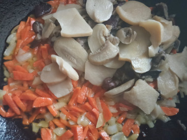 К обжаренным луку и моркови добавить консервированные шампиньоны. Мне попались мелкие грибы, если у вас более крупные шампиньоны, то их нужно нарезать на две или четыре части. Обжарить всё вместе, помешивая, около трёх- пяти минут.