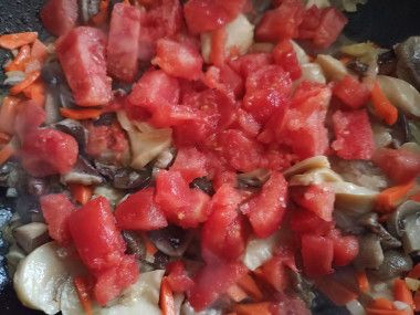 Затем отправить в кастрюлю помидор. Всё перемешать и тушить на сильном огне ещё около двух- трёх минут.