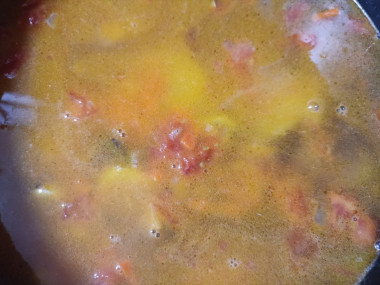 Помидор и картофель нарезать небольшими кубиками. С томата предварительно можно снять шкурку. Для этого нужно сделать крестообразный надрез на помидоре, залить сначала томат кипятком на несколько секунд, затем окунуть в холодную воду и удалить без труда кожицу.