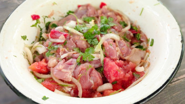 Раньше мне не приходилось вынимать кость из бедер и голеней, поэтому получилось у меня не очень аккуратно. Так что мясо я порезала помельче, чтобы было удобно нанизать на шампуры.