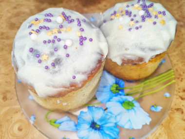 Намажьте глазурь на полностью остывшие куличи. Это важно, так как на теплых куличах она потечет из-за масла. Украшение в виде посыпок, которые должны приклеиться к глазури, нанесите сразу, иначе потом они скатятся с нее. Глазурь хорошо себя ведет при нарезке, не крошится и очень вкусная. Светлого праздника!