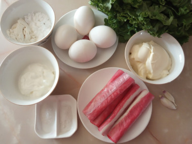 Каждую крабовую палочку аккуратно разрезаем вдоль на 4 длинных палочки. Листья салата разделяем по одному, отрывая твердое основание листика. Майонез смешиваем с перетертым чесноком. Можно добавить к чесноку мелконарезанный укроп или зеленый лук. Если использовать домашний майонез, то эта закуска станет еще и полезной.