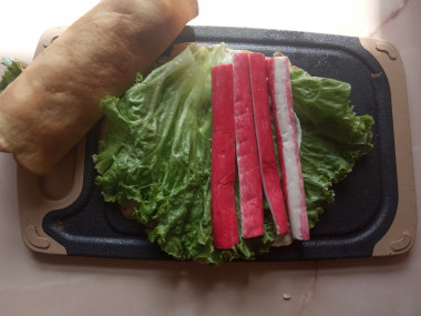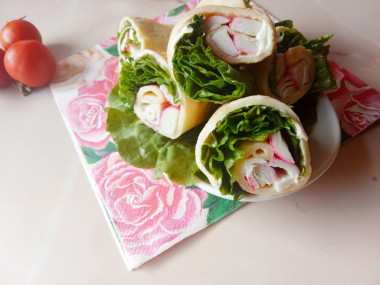 Развернутый блин смазываем тонко майонезом с чесноком. На половину блинчика выкладываем листики салата. Крабовые палочки выкладываем на салат на край блинчика и на серединку. Их нужно выкладывать вдоль оси скручивания блинчика. Скручиваем блин в рулет. Разрезаем готовые блинчики посередине.