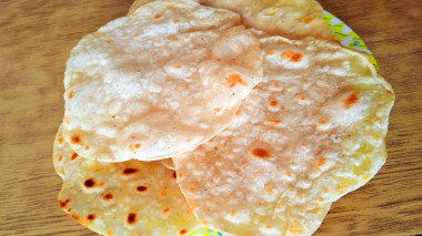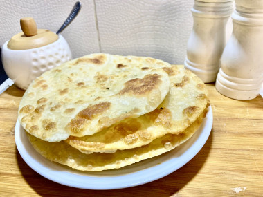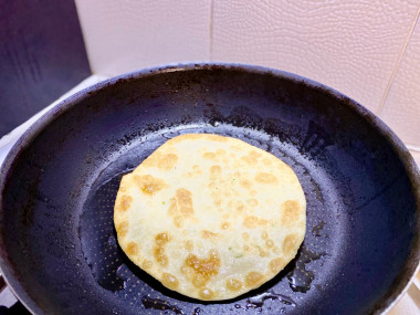На сковородке разогрейте растительное масло.О том, как выбрать сковороду и масло, читайте в отдельных статьях, ссылки в конце рецепта. По одному выкладывайте круги из теста в горячее масло и обжаривайте до подрумянивания. Переверните лепешку и обжарьте с другой стороны. Лепешки выкладывайте на большое блюдо, застеленное бумажными полотенцами. Готовые лепешки накройте перевернутой миской, чтобы они не сохли и размягчились от собственного тепла и влаги.