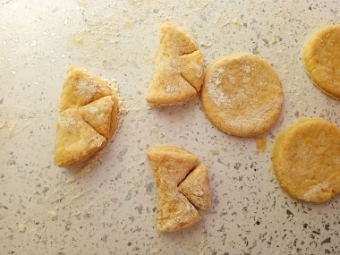 Включите разогреваться духовку до 180 градусов. Охлаждённое тесто достаньте из холодильника, на припылённом мукой столе раскатайте в пласт толщиной 0,5 см. С помощью круглых формочек или стакана вырежьте из него кружочки.