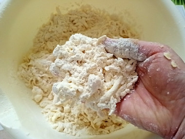 Добавьте просеянную муку и 2/3 от общего количества сахара. Тщательно перемешайте в течение нескольких минут, чтобы получились небольшие комочки. В итоге получается сыпучая смесь с большим количеством комочков.