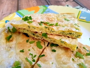 Купила круглые лаваши и стала искать на сайте рецепт, чтобы приготовить что-то вкусное и быстрое. Приглянулась тортилья с сыром и яйцом на сковороде. Лаваш отличается от кукурузных лепешек, но получилось тоже замечательно. Жарила лепешку на обычной сухой сковороде. Сыр решила сразу смешать с яйцами и зеленью, чтобы успел расплавиться. Яиц взяла 4 штуки, чтобы начинки побольше было. Обжаривала все время под крышкой. Лепешка не подгорела, только слегка подрумянилась. Верх смазала сливочным маслом для мягкости и сочности. Лепешка получилась просто отличной: вкусная, сытная, красивая. Похоже на слоеный пирожок)
