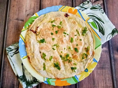 Накройте начинку второй лепешкой и прижмите. Лепешку переверните и готовьте еще 2-3 минуты.