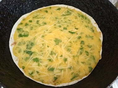 Сверху вылейте взбитые яйца, стараясь, чтобы масса не вытекла за пределы лепешки. Накройте сковороду крышкой и жарьте тортилью 5 минут на среднем огне.