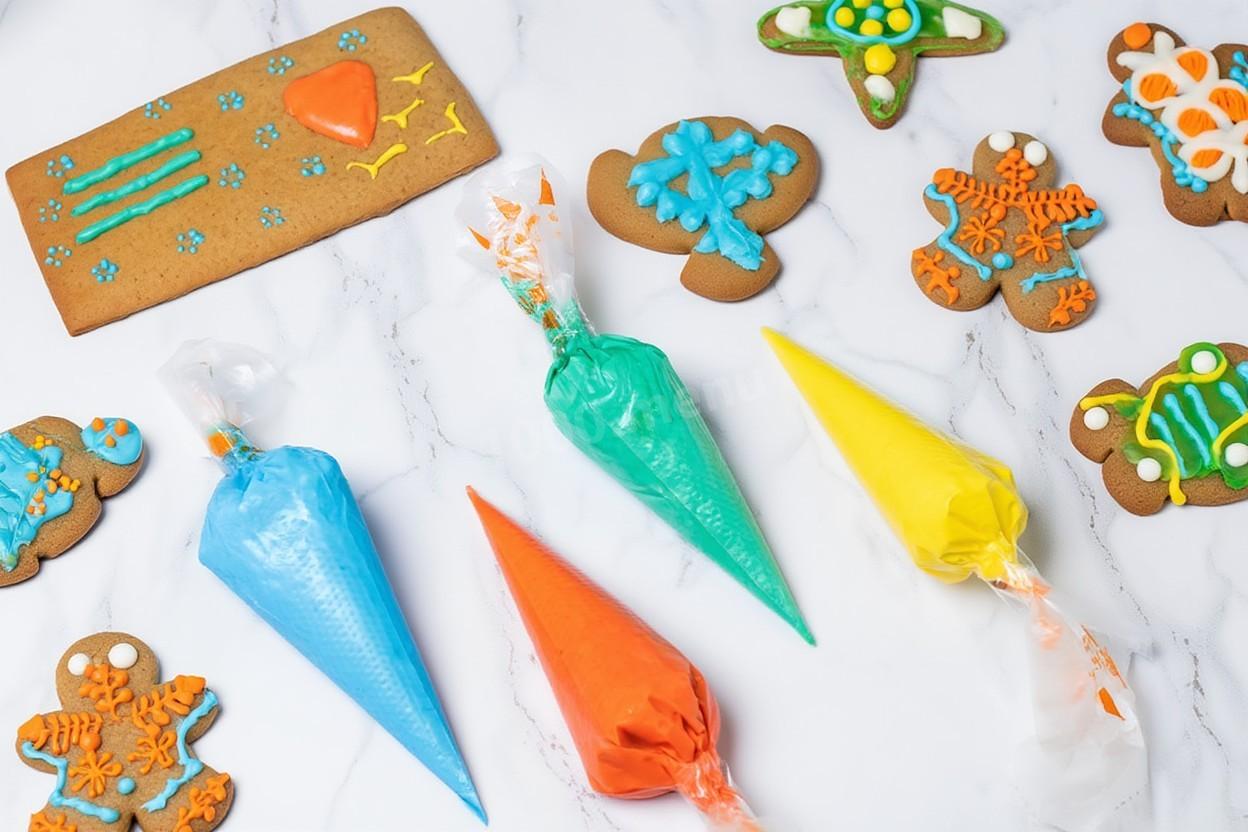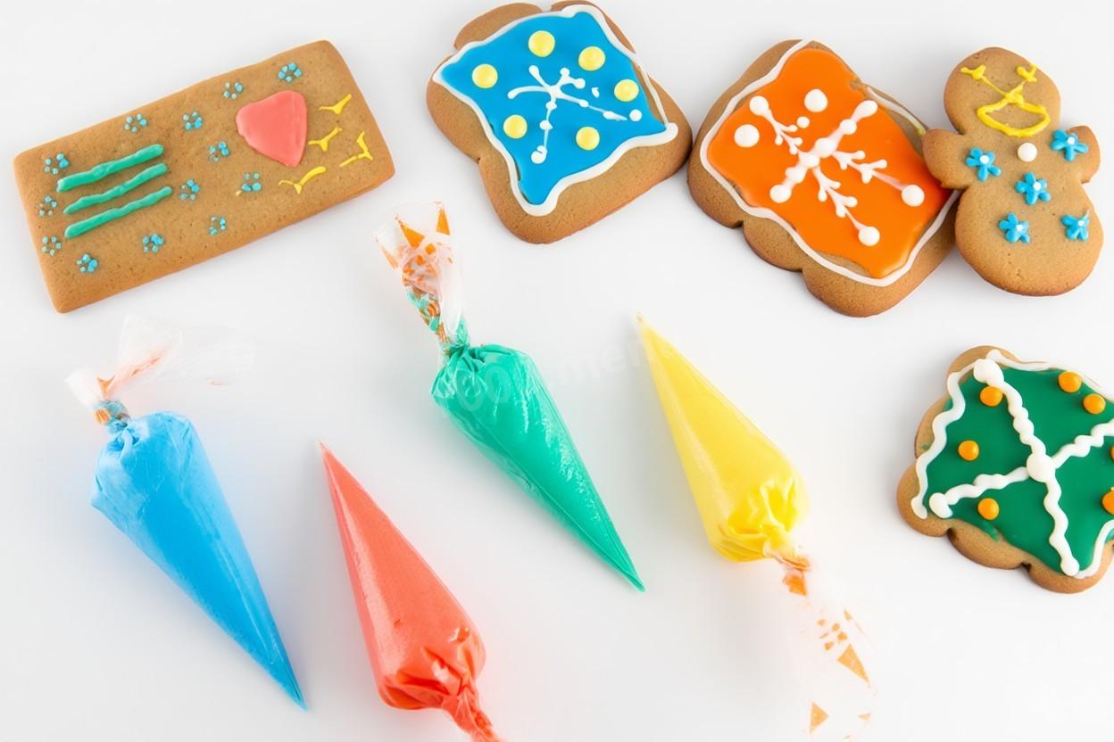 Теперь готовую глазурь переложите в пакетики и туго затяните их скотчем. Айсинг готов! Теперь распишите пряники цветной глазурью. Таким королевским айсингом можно украсить также торты, печенья.