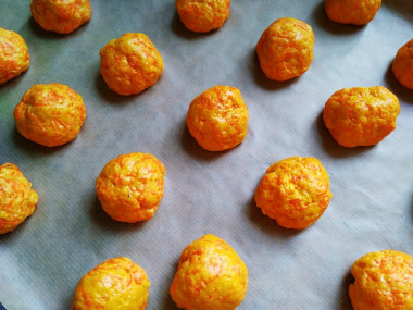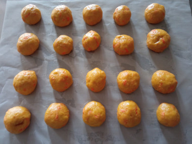 Возьмите противень, застелите его пергаментом для выпечки. Смачивая руки холодной водой, скатайте шарики размером с крупный грецкий орех. Разложите их на расстоянии друг от друга, так как печенье при выпечке увеличится в размере.