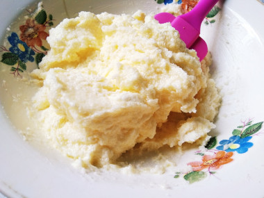 Возьмите большую миску, положите туда мягкое сливочное масло. Всыпьте сахар. Перемешайте масло с сахаром при помощи лопатки. Цель процесса — не взбить, а просто соединить продукты, поэтому миксером пользоваться не нужно.