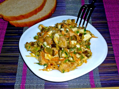 В салатнике соедините обжаренные овощи и курицу, перемешайте. На данном этапе можно дополнительно посолить салат, если есть такая необходимость, и добавить ещё подсолнечного масла.