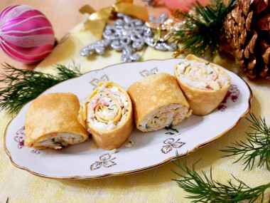 На Новый год приготовила вот эти симпатичные яичные рулетики с крабовыми палочками и сыром. Блинчики готовятся быстро и хорошо переворачиваются. Как и советует автор, использовала блинную сковородку. У меня получилось 5 блинчиков. Для начинки взяла 180 грамм крабовых палочек, 70 грамм плавленного сырка и 50 грамм твёрдого сыра. Ну и, конечно, зелень - укроп. Поскольку мне показалось, что у меня крабовые палочки не раскручиваются, то я всю начинку натерла на крупной тёрке и заправила майонезом. Потом я поняла, что всё-таки можно было раскрутить))) Яичные рулетики получились очень вкусные, нежные, начинка хорошо сочеталась с самими блинчиками. И красивенькие такие! Взяла рецепт на заметку. Буду использовать рецепт блинчиков как основу, а с начинкой можно экспериментировать. В следующий раз хочу, как и автор, положить внутрь блинчиков раскрученные крабовые палочки. Должно быть красиво) Благодарю автора за рецепт! Вот мой фотоотчетик)))