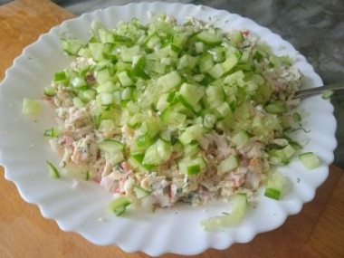 Сделала начинку из сыра, крабовых палочек и майонеза. Мои палочки не разворачивались, поэтому я их мелко порубила. Для пикантности в майонез добавила зернистой горчицы. Все смешала, попробовала начинку, но вышло немного солоновато. Чтоб нейтрализовать соль и для хрусткости добавила свежего огурчика. Начинила блинчики, скрутила в рулеты, разрезала на роллы. Вуаля! Закуска к приходу новых гостей готова. А завтра – прощай, Масленица!