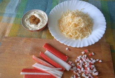 Как сделать яичные рулетики из крабовых палочек с сыром? Подготовьте необходимые ингредиенты. Крабовые палочки лучше использовать охлаждённые, если же они замороженные, их следует предварительно разморозить. Выбирайте качественный сыр и майонез, от этого во многом зависит вкус готового блюда. Майонез можно сделать самостоятельно, рецепты найдете после описания последнего шага.