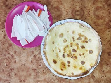 Возьмите крабовые палочки по количеству готовых блинчиков. Иногда крабовые палочки сложно развернуть, они ломаются. Чтобы этого избежать, опустите палочки на 20 секунд в кипяток.