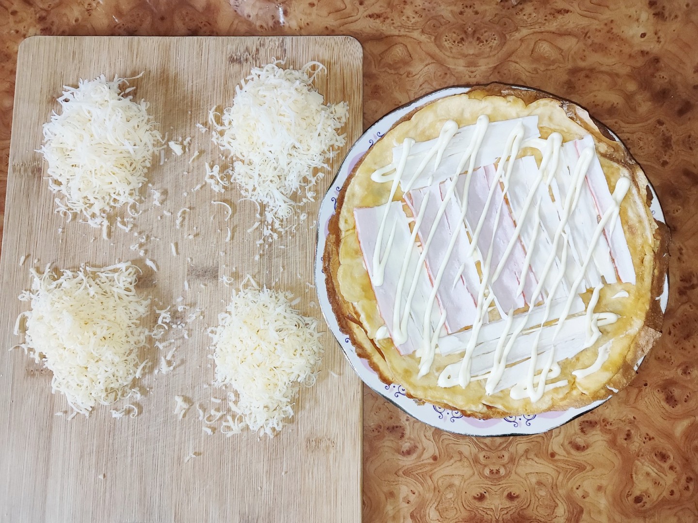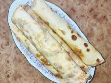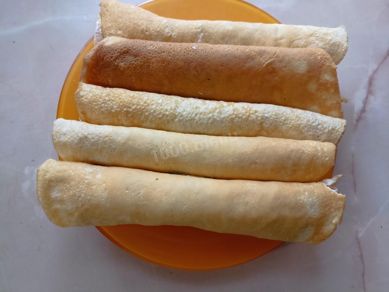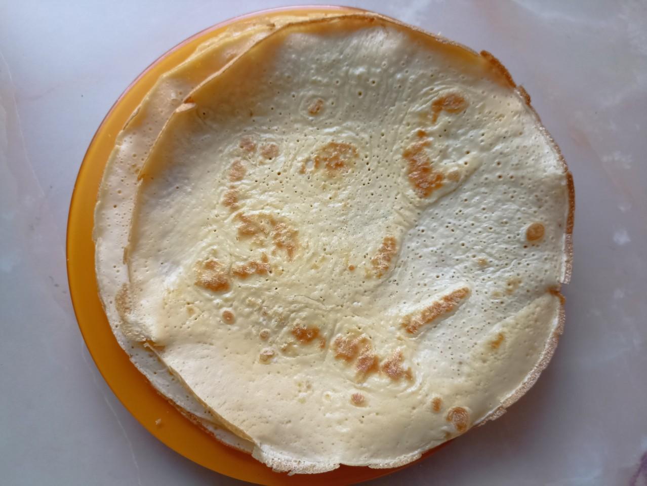 Из этого количества теста получается 4-5 тонких блинчиков ( в зависимости от размера сковороды)