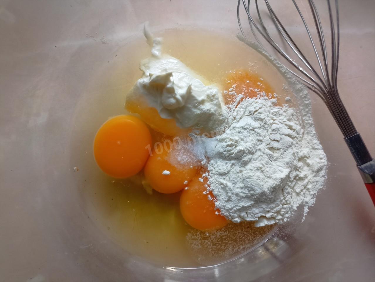 Куриные яйца перед приготовлением блинчиков обязательно тщательно вымойте. Разбейте их в чашку, немного присолите, добавьте сметану и пшеничную муку. Муку добавляйте частями, ведь её может понадобиться чуть больше или чуть меньше. Ориентируйтесь по консистенции теста. Подробнее об этом читайте в конце рецепта.
